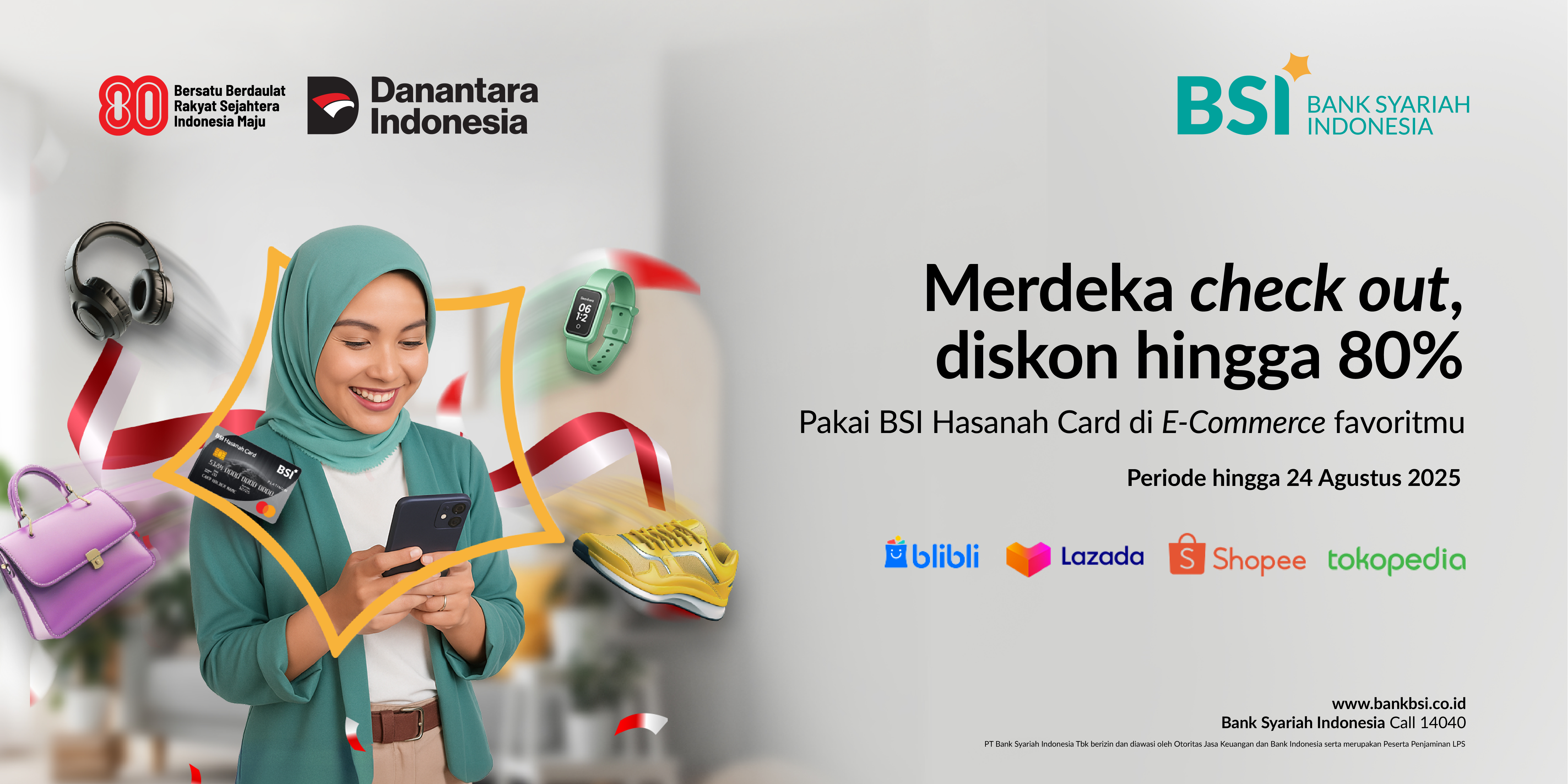 17 Agustus 2025 | Diskon 80% hingga Rp 100.000,- minimal transaksi Rp 100.000,- | BSI17FEST | 20/period | ||