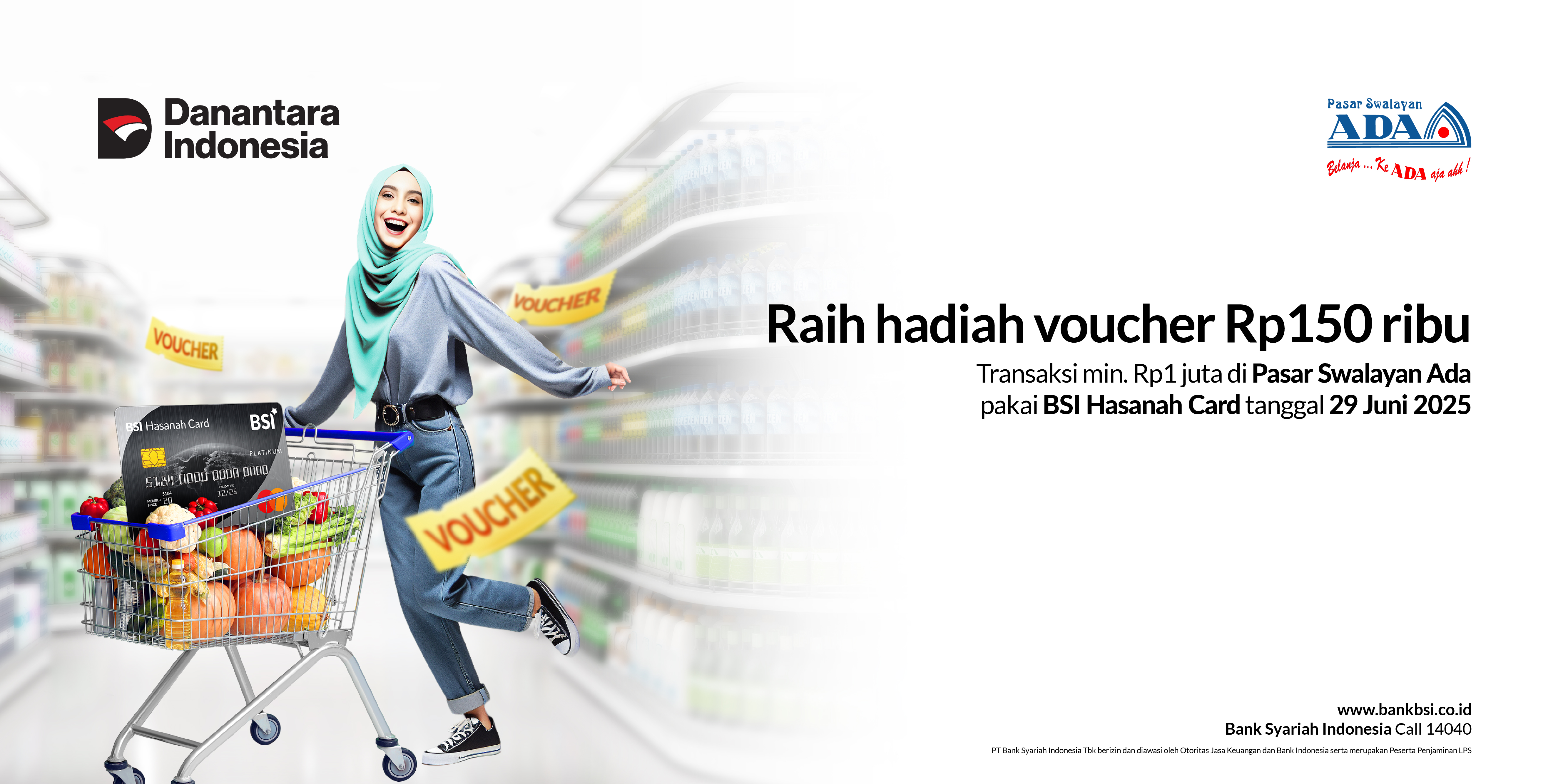 Mekanisme Program | Voucher akan diberikan secara langsung ketika pemegang kartu melakukan pembayaran sesuai syarat dan ketentuan program di outlet Pasar Swalayan ADA dengan menggunakan BSI Hasanah Card. |