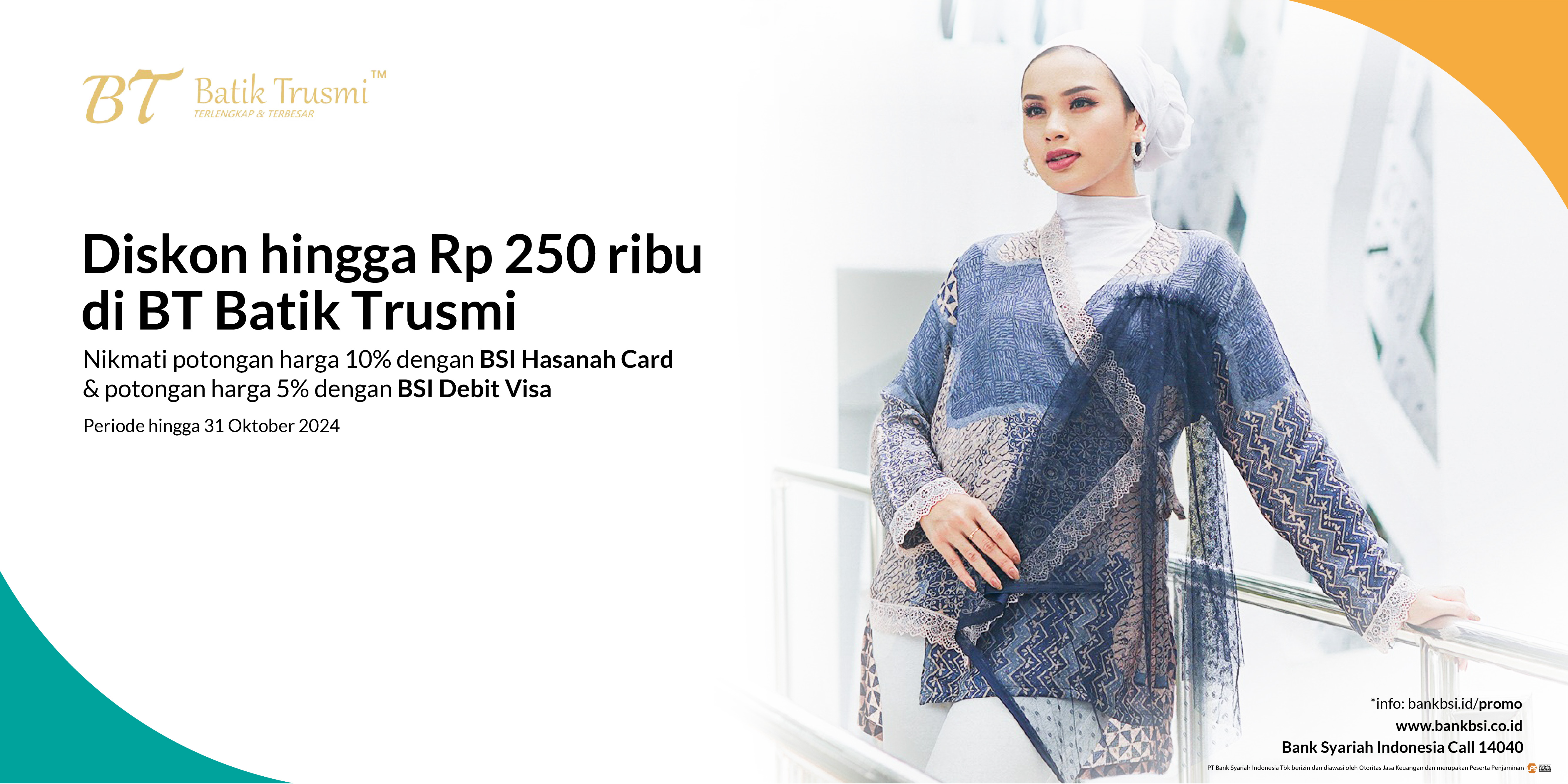 A : Promo Kartu BSI yang berlaku di BT Batik Trusmi adalah sebagai berikut: