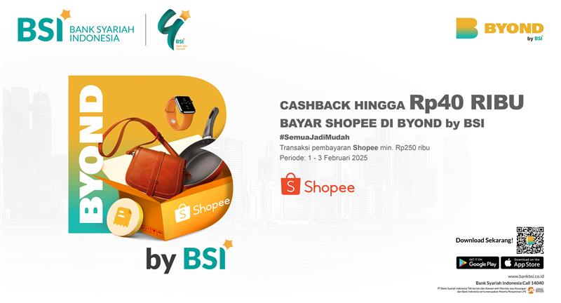 | Deskripsi Program | Pemberian cashback saldo tabungan hingga sebesar Rp40.000,- (empat puluh ribu rupiah) dalam rangka Milad BSI yang ke-4 diperuntukkan bagi nasabah perorangan yang berhasil melakukan transaksi pembayaran Shopee melalui BYOND by BSI minimal Rp250.000 (dua ratus lima puluh ribu rupiah). | ||||||