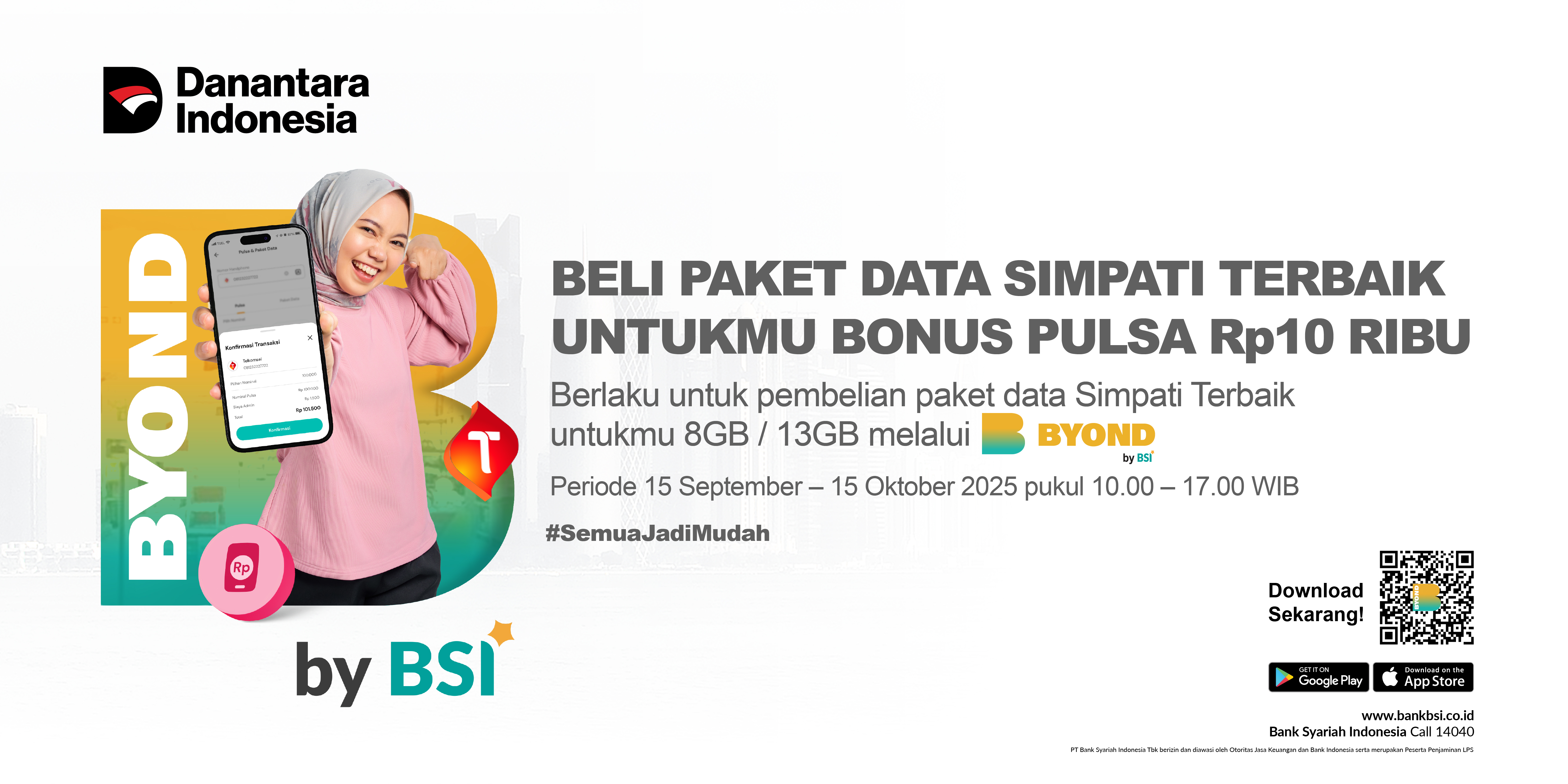 | Deskripsi Program | Program pemberian pulsa regular Telkomsel senilai 10K diperuntukkan bagi Nasabah perorangan yang berhasil melakukan transaksi pembelian Paket Data SIMPATI Terbaik Untukmu yang sudah ditentukan melalui BYOND by BSI. | ||||||
