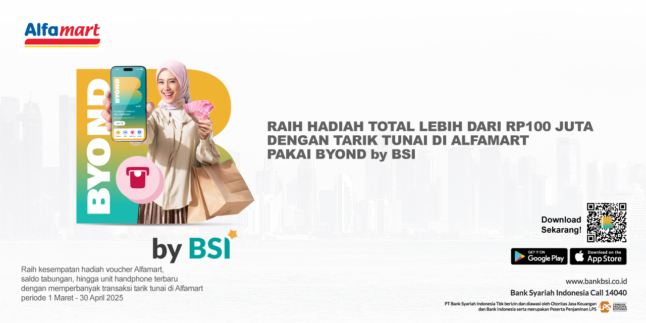 | Definisi Program | Promo racing transaksi untuk nasabah yang terbanyak melakukan transaksi tarik tunai tanpa kartu melalui BYOND by BSI di outlet Alfamart berkesempatan mendapatkan hadiah Unit Handphone Samsung S24, Saldo Tabungan, atau Voucher Belanja Alfamart |