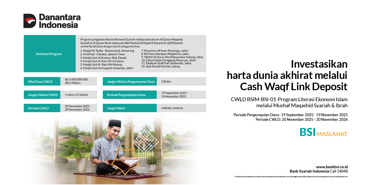 | 9 | Ketentuan lain-lain | Partisipasi pada CWLD BSIM-BSI-SERI 01–Program Literasi Ekonomi Islam Melalui Mushaf Al Quran Maqashid Syariah & Ibrah dapat dilakukan di cabang BSI terdekat. |