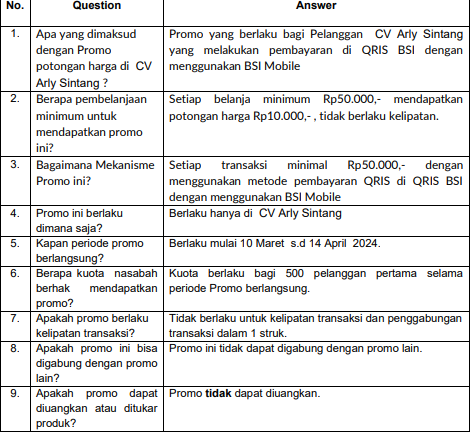 5. Promo ini berlaku untuk seluruh Pengguna yang melakukan metode pembayaran dengan menggunakan fitur QRIS BSI Mobile dan di scan pada stiker BSI QRIS di CV Arly Sintang pada saat bertransaksi.