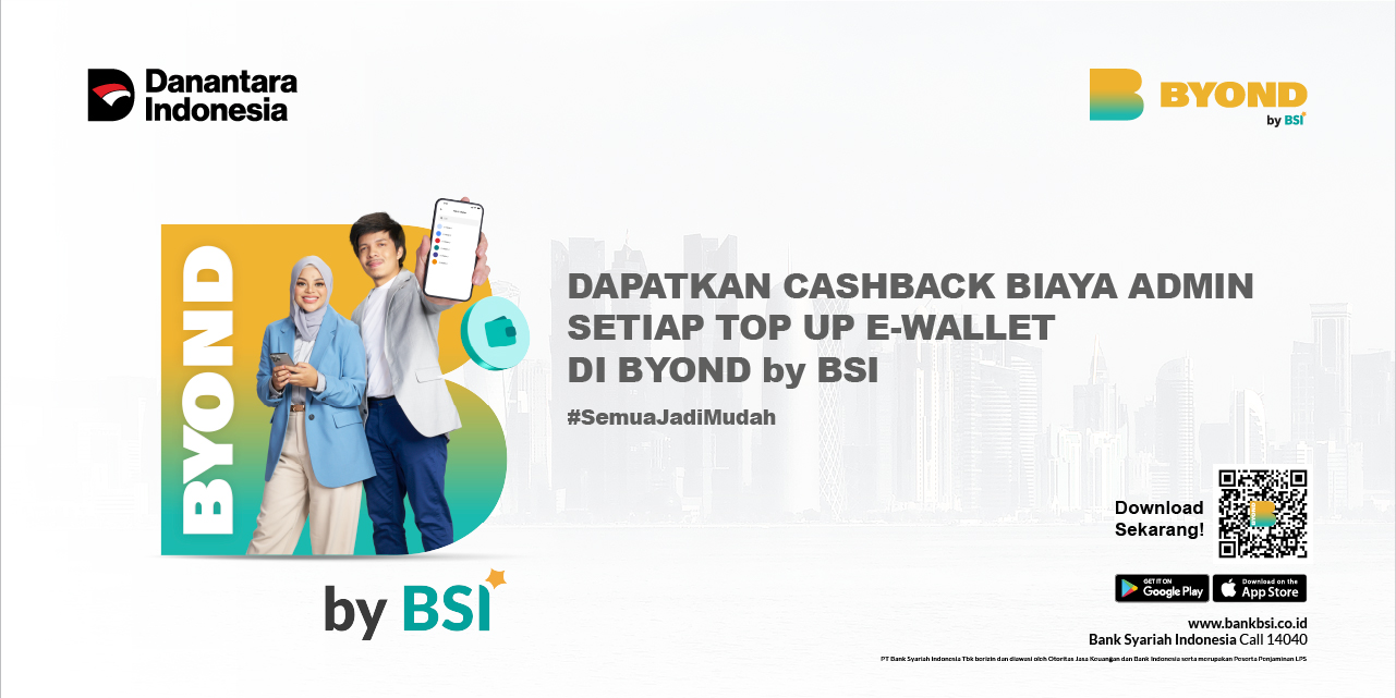 | 1. | Apa yang dimaksud dengan Cashback Biaya Admin e-Wallet BYOND? | Program pemberian cashback biaya Admin senilai Rp 1.500,- kepada nasabah yang mendapatkan penawaran melalui push notification dan melakukan top up e-Wallet di BYOND by BSI pada periode program |