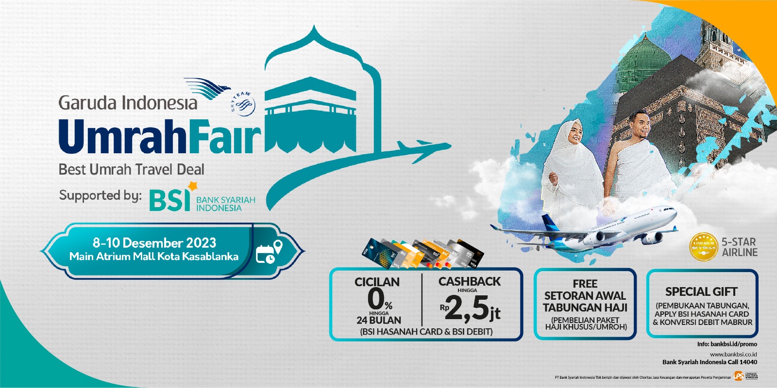 A: Garuda Indonesia Umrah fair adalah Event yang diselenggarakan oleh Garuda yang disponsori oleh Bank Syariah Indonesia bekerjasama dengan Travel Haji & Umrah dan Agent Travel rekanan untuk menawarkan paket Haji Khusus dan Umroh dengan harga terbaik beserta penawaran program dan produk BSI.