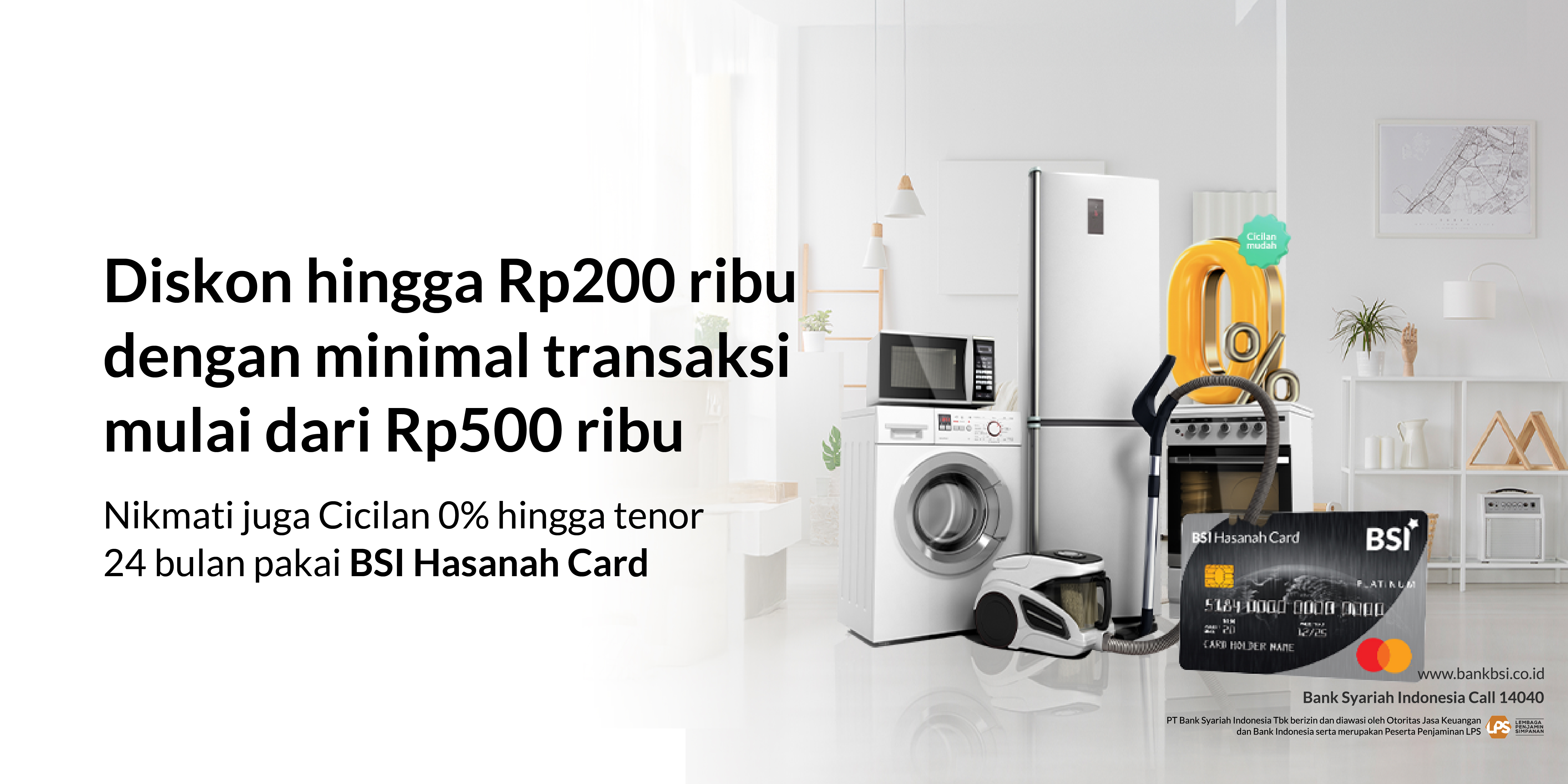 • Diskon 8% sd Rp1,2 juta, min. transaksi Rp12 juta  kode promo : H12-BSI3