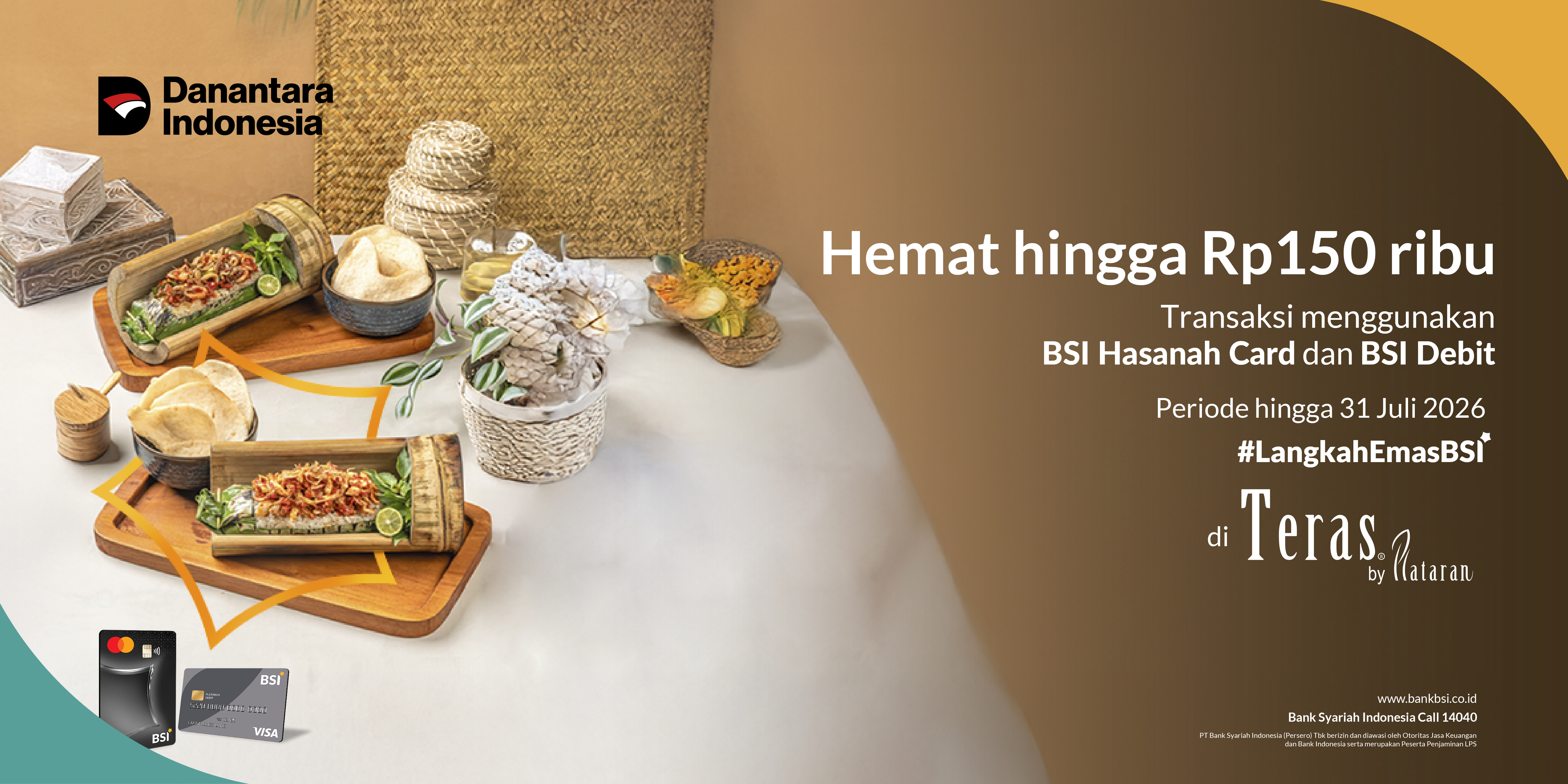 1. Promo Reguler (20 – 31 Januari, 1 April – 31 Juli 2026) - Diskon 15% hingga Rp 150.000,- minimal transaksi Rp 400.000,- berlaku untuk BSI Hasanah Card dan BSI Debit Visa. 2. Promo Milad BSI dan Ramadan (1 Februari – 31 Maret 2026) - Diskon 50% hingga Rp 150.000,- minimal transaksi Rp 300.000,- berlaku untuk BSI Hasanah Card dan BSI Debit Visa. |