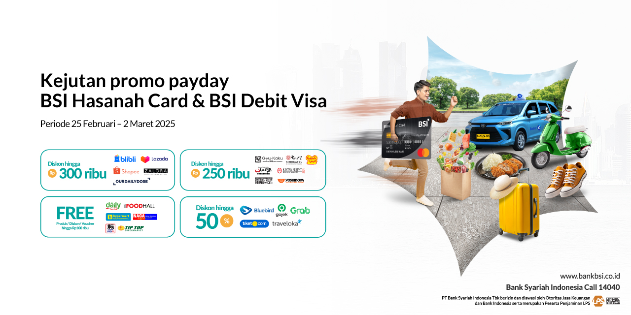 | Super Indo | Diskon Rp 50 ribu min. transaksi Rp 750 ribu | - Berlaku tanggal 25 – 27 Februari - Berlaku setiap hari selama Periode Program; - Program berlaku di seluruh Outlet Super Indo dan Super Indo Express; - Tidak berlaku untuk kelipatan transaksi dan split bill; - Program dibatasi untuk 1 kartu BSI Hasanah Card hanya dapat berpartisipasi sebanyak 1 (satu) kali transaksi di hari yang sama; - Program berlaku untuk semua jenis kartu BSI Hasanah Card (Classic, Gold, Platinum); - Tidak dapat digabungkan dengan promo lainnya; - Program tidak berlaku untuk BSI Debit Card. - Selama periode promo taktikal Payday BSI Hasanah Card, maka promo regular BSI Hasanah Card tidak berjalan (hold sementara) |