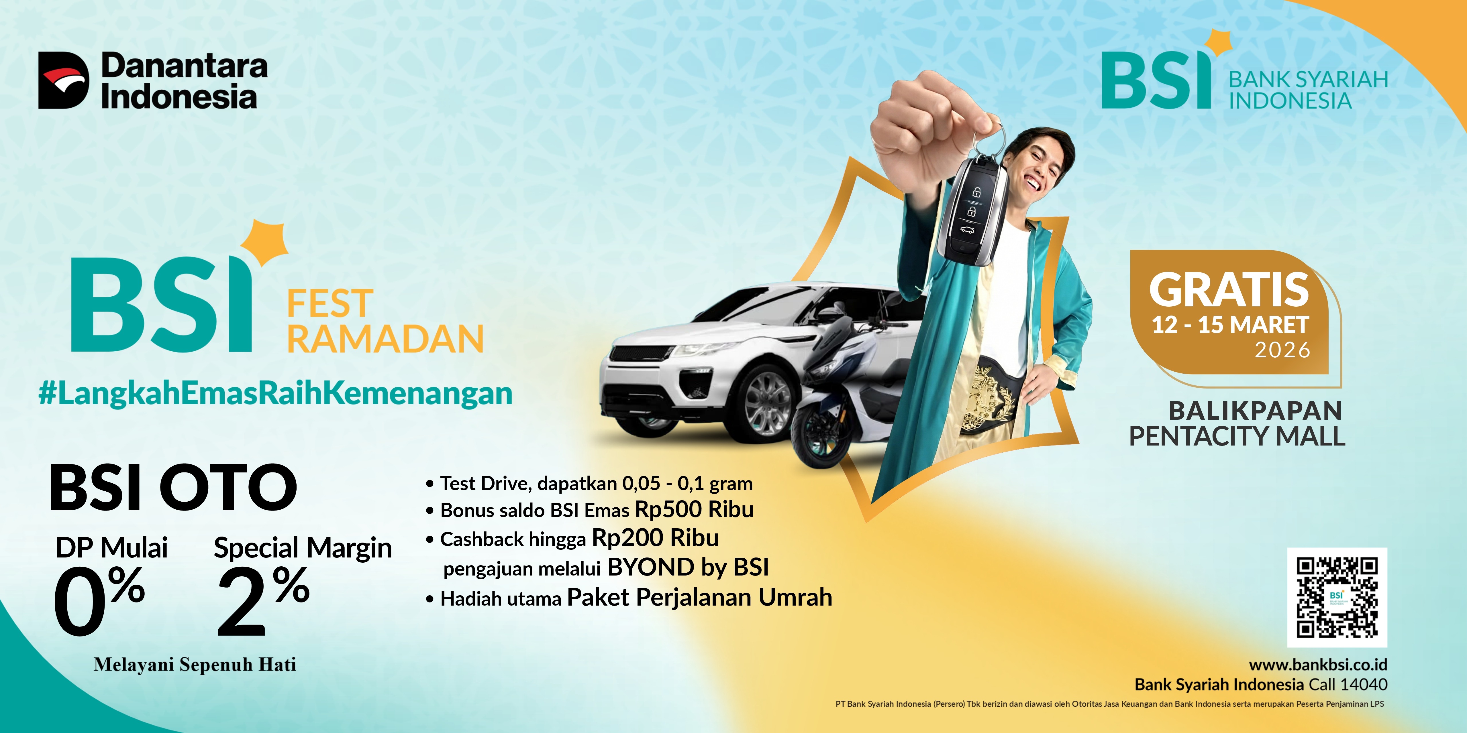 BSI OTO memberikan promo khusus kepada nasabah terundang maupun nasabah umum yang hadir di lokasi event BSI Fest Ramadhan sebagai berikut: a. Special Margin mulai 2% Special Price 2% khusus untuk pembiayan mobil baru dengan tenor 1 tahun​ dan diberikan kepada segmen nasabah CPNS/ PNS, ASN non ASN (Kementerian, Lembaga Pemerintahan, Badan Layanan Umum (BLU) dan PTNBH, BUMN/ BUMD dan anak Perusahaan, Dokter & Pegawai Rumah Sakit, Nasabah Wholesale/ Commercial/ Institutional/ Corporate/ SME BSI, Pegawai Swasta Payroll, Nasabah Prioritas, serta nasabah yang mendapatkan fasilitas COP dari perusahaan. b. DP mulai 0% DP 0% dapat diberikan kepada nasabah dengan segmen ASN BO2, BUMN Group, Dokter, Nasabah Private & Prioritas, serta nasabah perorangan yang bekerja di Perusahaan yang telah ber-PKS dengan BSI dalam pemberian fasilitas COP. c. Promo Golden Drive yaitu promo saldo BSI e-mas khusus untuk nasabah yang melakukan test drive kendaraan yang berpartisipasi di event BSI Fest Ramadan 2026 di lokasi event selama tanggal event (merk dan type kendaraan mengikuti keikutsertaan kendaraan tersebut di setiap titik lokasi event) sebagai berikut: