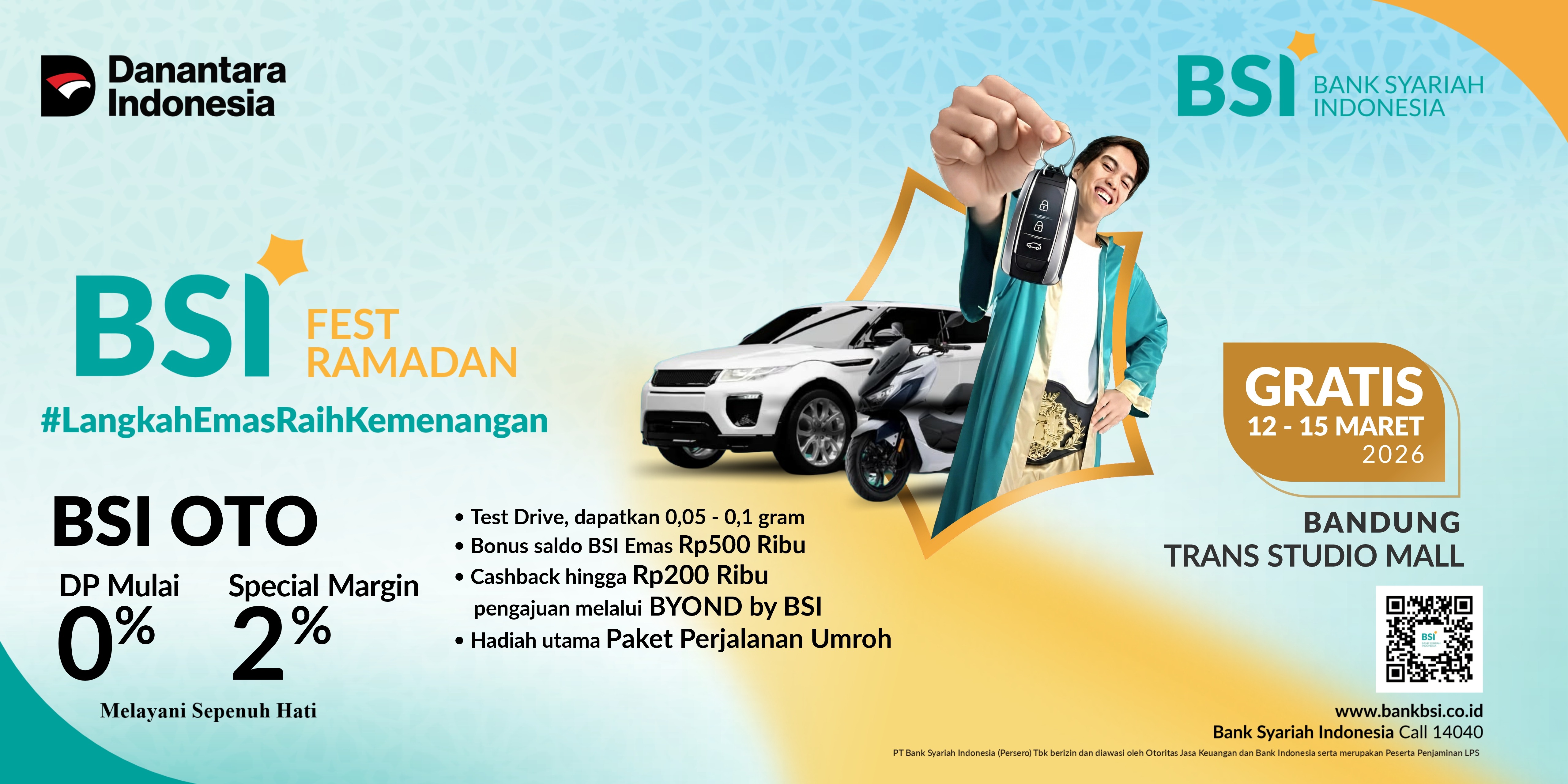 BSI OTO memberikan promo khusus kepada nasabah terundang maupun nasabah umum yang hadir di lokasi event BSI Fest Ramadhan sebagai berikut: a. Special Margin mulai 2% Special Price 2% khusus untuk pembiayan mobil baru dengan tenor 1 tahun​ dan diberikan kepada segmen nasabah CPNS/ PNS, ASN non ASN (Kementerian, Lembaga Pemerintahan, Badan Layanan Umum (BLU) dan PTNBH, BUMN/ BUMD dan anak Perusahaan, Dokter & Pegawai Rumah Sakit, Nasabah Wholesale/ Commercial/ Institutional/ Corporate/ SME BSI, Pegawai Swasta Payroll, Nasabah Prioritas, serta nasabah yang mendapatkan fasilitas COP dari perusahaan. b. DP mulai 0% DP 0% dapat diberikan kepada nasabah dengan segmen ASN BO2, BUMN Group, Dokter, Nasabah Private & Prioritas, serta nasabah perorangan yang bekerja di Perusahaan yang telah ber-PKS dengan BSI dalam pemberian fasilitas COP c. Promo Golden Drive yaitu promo saldo BSI e-mas khusus untuk nasabah yang melakukan test drive kendaraan yang berpartisipasi di event BSI Fest Ramadan 2026 di lokasi event selama tanggal event (merk dan type kendaraan mengikuti keikutsertaan kendaraan tersebut di setiap titik lokasi event) sebagai berikut: