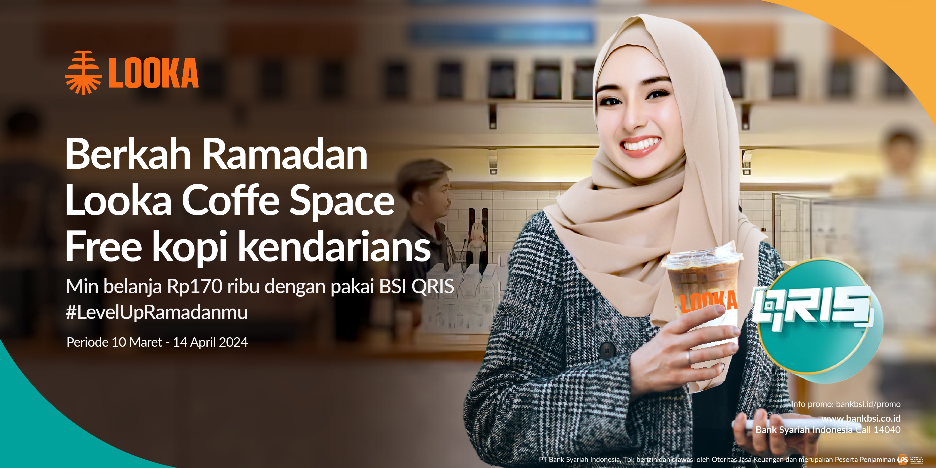 Promo ini berlaku untuk seluruh Pengguna yang melakukan metode pembayaran dengan menggunakan fitur QRIS BSI Mobile dan di scan pada stiker BSI QRIS di Looka Coffee Space pada saat bertransaksi.
