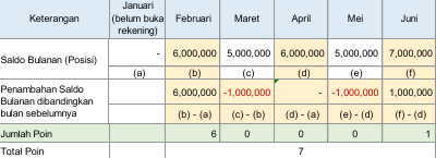 | 8. | Apakah yang dimaksud dengan "Saldo Rata-rata Bulanan (ending balance)" | Jumlah saldo yang tercatat di rekening nasabah pada hari terakhir setiap bulan kalender (per tanggal 30 atau 31, atau 28/29 untuk Februari), setelah seluruh transaksi bulan tersebut dibukukan. |