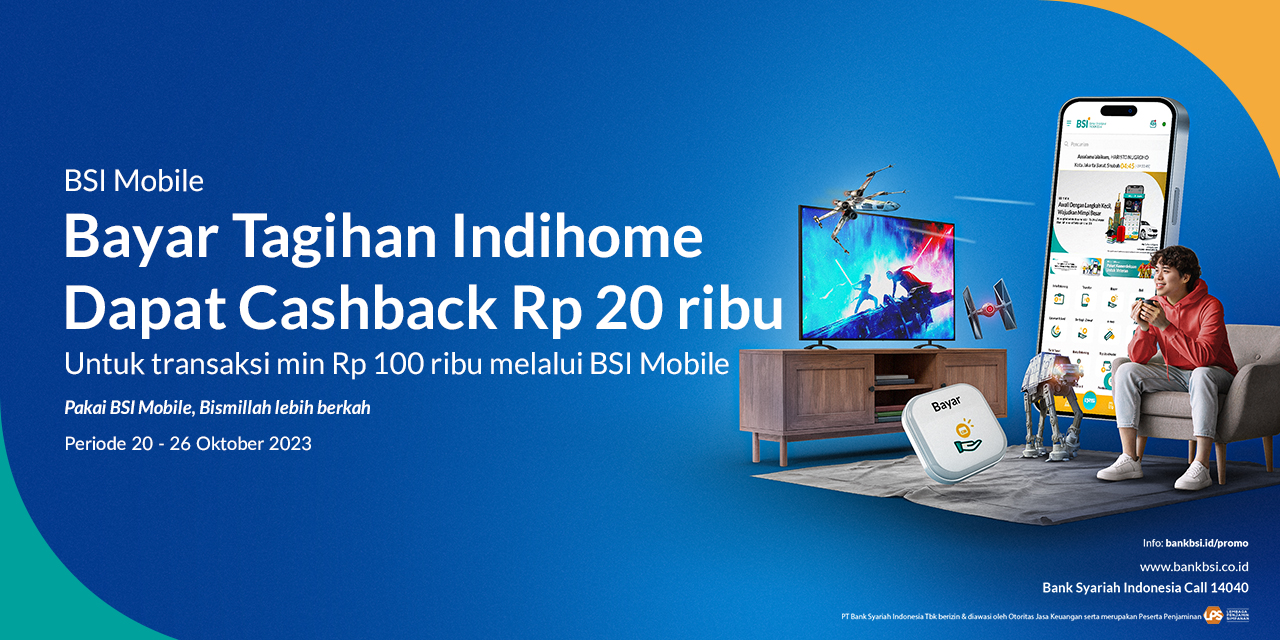 Pemberian cashback sebesar Rp.20.000,- (dua puluh ribu rupiah) diperuntukkan bagi Nasabah yang berhasil melakukan pembayaran tagihan Indihome melalui BSI Mobile minimal Rp. 100.000,- (seratus ribu rupiah). |