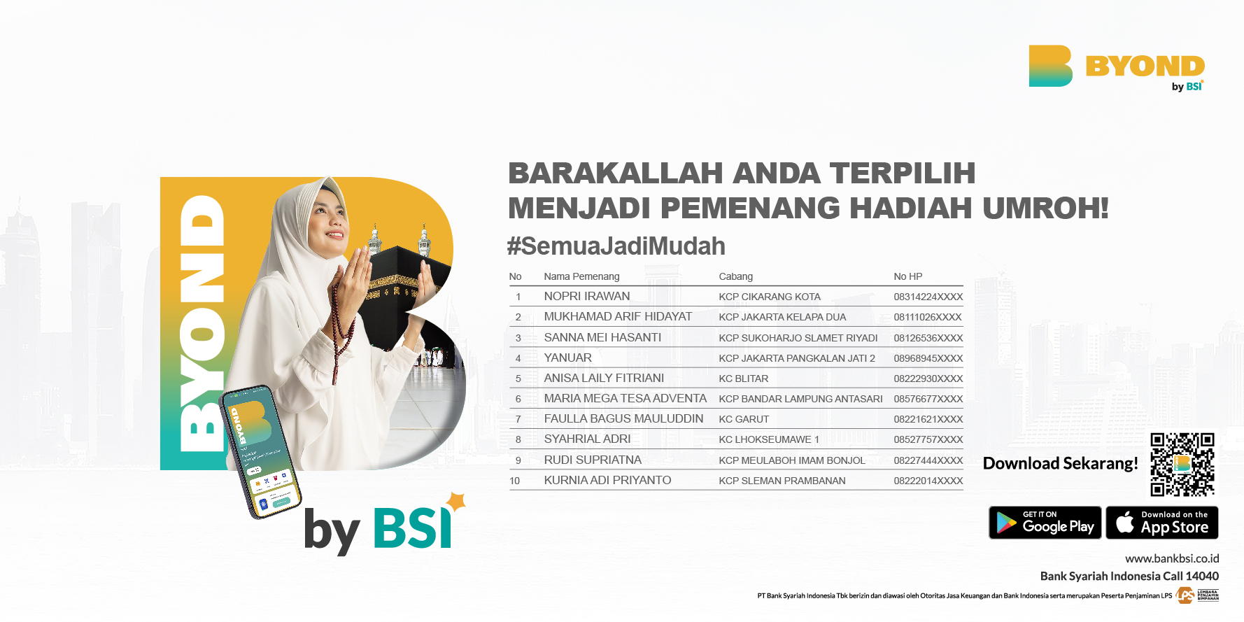 Terima kasih atas partisipasi seluruh nasabah, nantikan program menarik dari BYOND by BSI berikutnya informasi pemenang Program Migrasi Berhadiah Umroh dapat mengakses lampiran berikut ini :