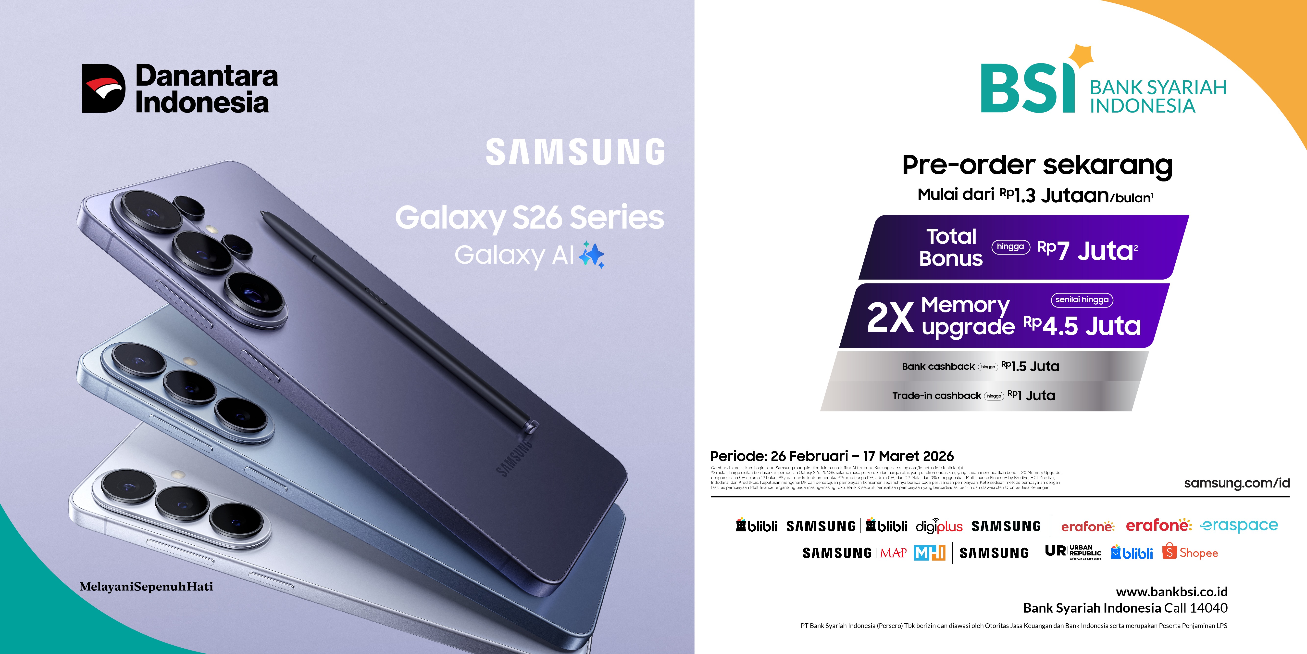 - Promo Cashback dapat digabungkan dengan e – voucher Hand Raiser dan atau promo yang berlaku di https://www.samsung.com/id/multistore/bsi_offer/