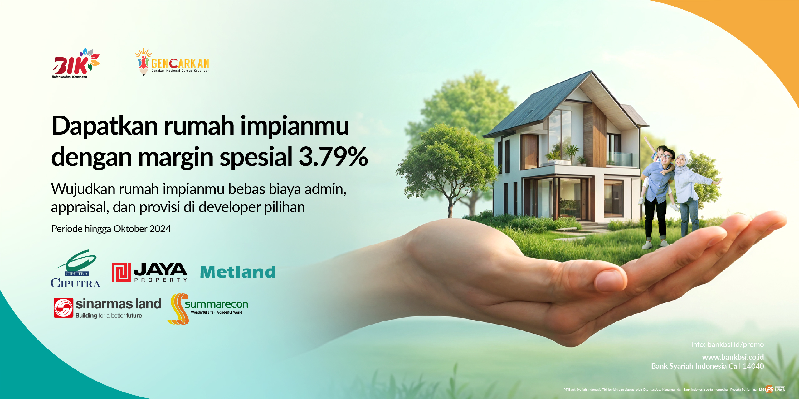 | Dimana saja special margin ini berlaku? | Berlaku untuk pembelian rumah/apartmenI baru di seluruh Proyek Kerja Sama BSI dengan developer terpilih, yakni Ciputra Group, Metland, Sinarmas Land, Summarecon, dan JAYA Group | ||||||||||||||||||||