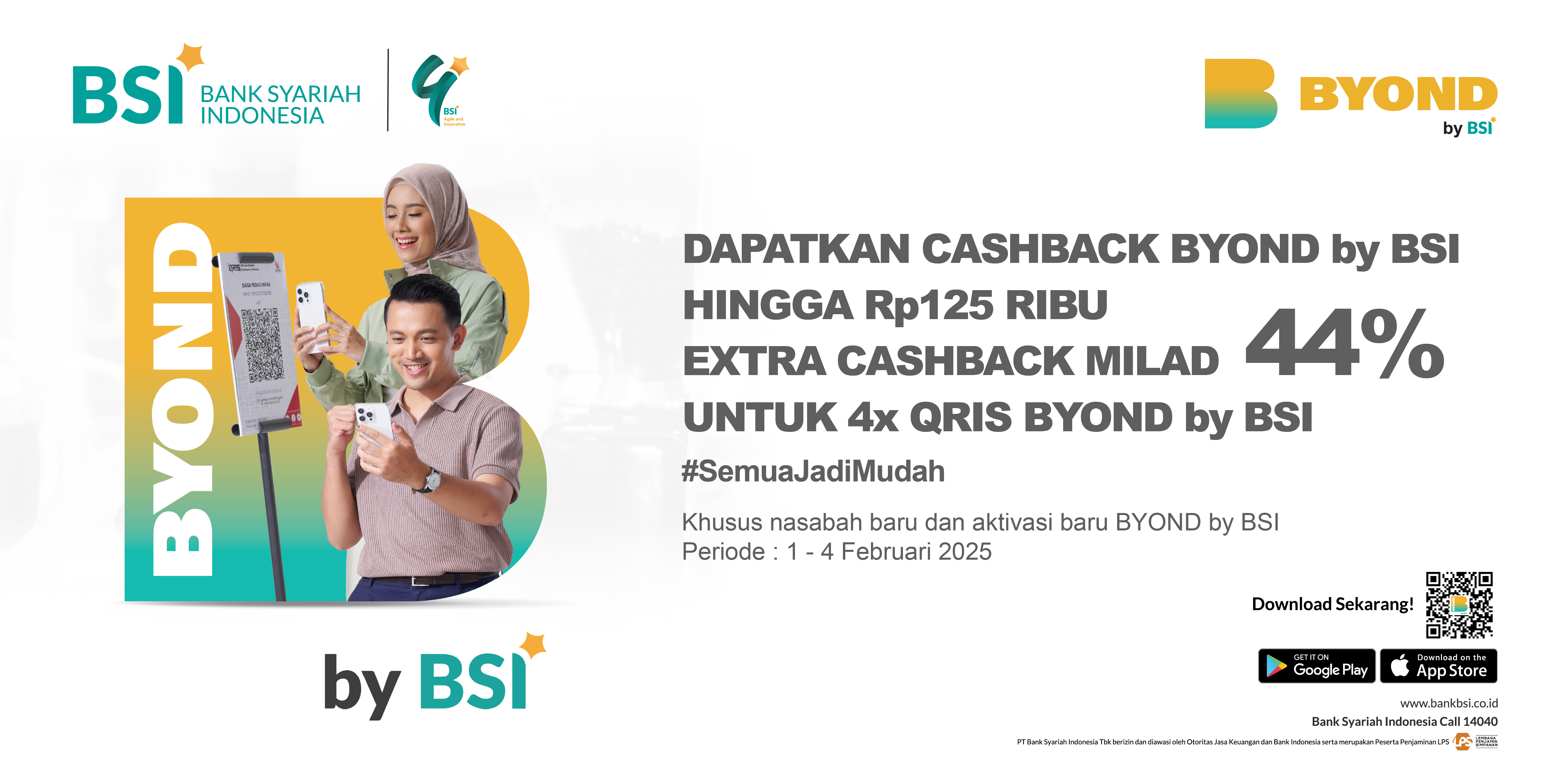 Ada, nasabah baru BSI wajib melakukan registrasi BYOND dan min 1x transaksi di masing-masingi kategori; QRIS, Top Up, dan Transfer (selain sesama BSI) selama periode 01 – 04 Februari 2025. |