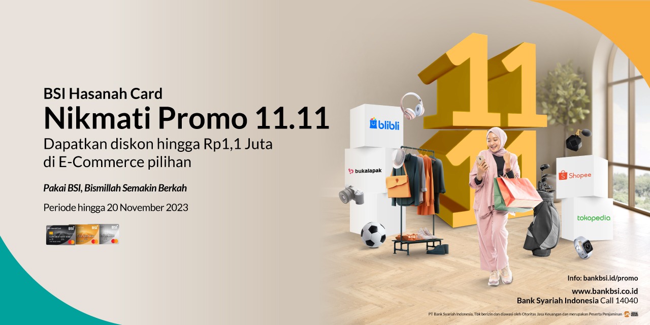 Program promo “11.11” untuk pemegang BSI Hasanah Card yaitu pemberian potongan harga hingga Rp1.1 juta melalui mobile aplikasi Tokopedia, Shopee, BliBli dan Bukalapak |
