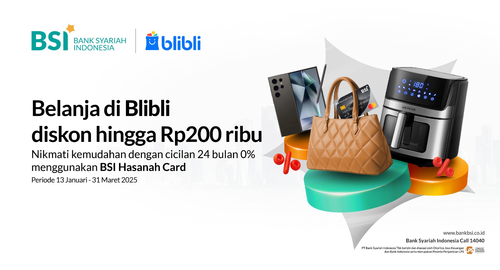 | HICE (Electronic & Gadget) | Diskon 5% hingga Rp200 ribu, min. transaksi Rp1.5 juta | - Berlaku untuk seluruh jenis BSI Hasanah Card (Classic, Gold, Platinum). - Berlaku 1x / kartu / bulan. - Berlaku dengan pembayaran cicilan . - Berlaku memasukkan kode promo: HICE25-BSI. |