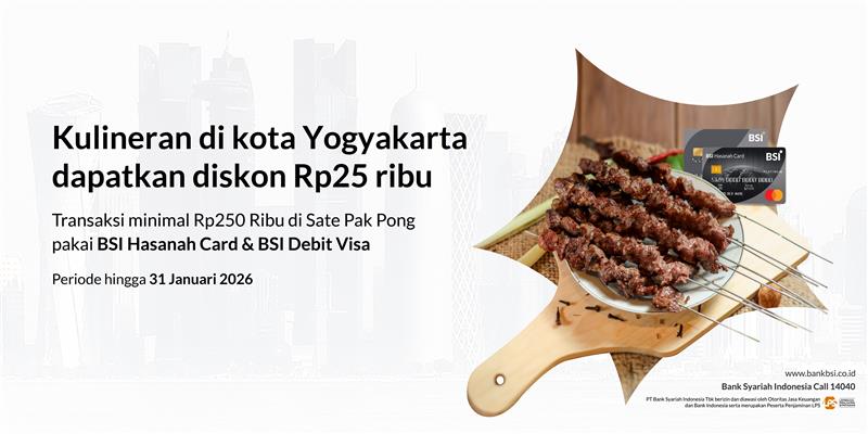 | Mekanisme Promo | Diskon akan memotong nominal transaksi pemegang BSI Debit dan Hasanah Card di Sate Klathak Pak Pong sesuai syarat & ketentuan transaksi |