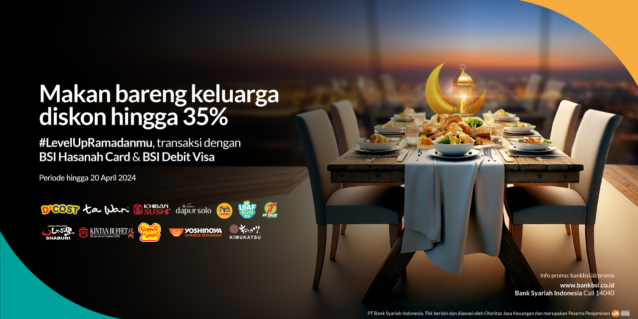 8 | Hokben | BSI Hasanah Card : maksimal diskon Rp 25.000,- BSI Debit Visa : maksimal diskon Rp 30.000,- |