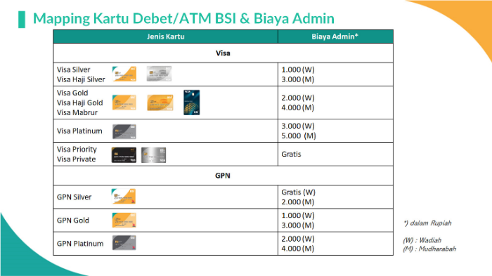 Berikut adalah biaya transaksi dan adminisitrasi bulanan kartu BSI Debit