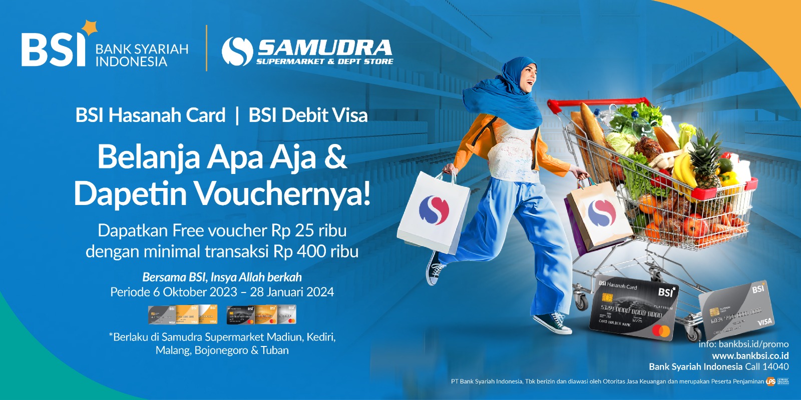 · Minimum transaksi Rp 400 ribu · Berlaku untuk jenis BSI Debit (Visa) dan BSI Hasanah Card (Classic, Gold, Platinum) · Berlaku setiap hari Jum’at, Sabtu dan Minggu · Berlaku di Samudra Supermarket Madiun, Kediri, Malang, Bojonegoro & Tuban · Berlaku 1 (satu) BSI Card per hari · Voucher hanya dapat digunakan untuk transaksi selanjutnya · Tidak berlaku untuk kelipatan transaksi dan split bill · Tidak berlaku untuk kartu BSI Debit GPN |