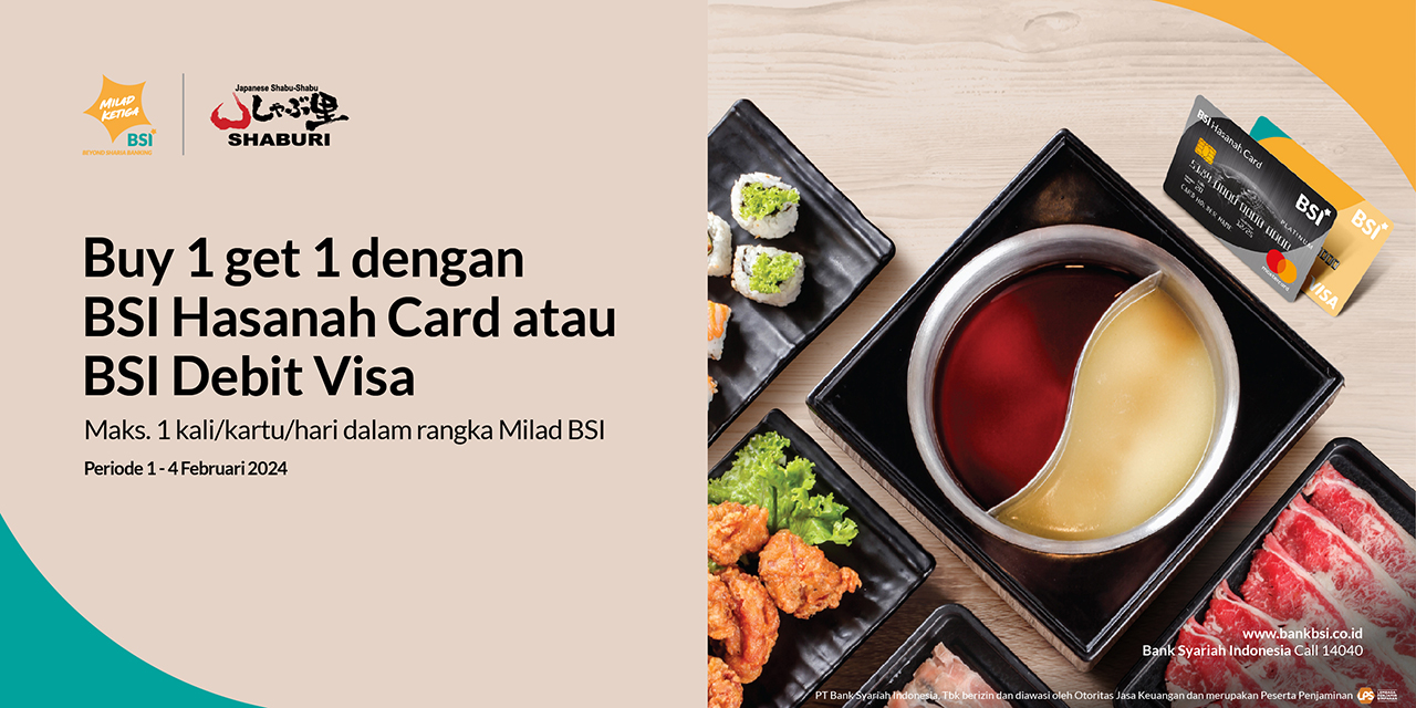 A : Jika pengguna BSI Hasanah Card dan BSI Debit Visa melakukan transaksi di Shaburi dengan menggunakan BSI Hasanah dan BSI Debit Visa akan mendapatkan promo Buy 1 Get 1 Langsung selama periode promo.