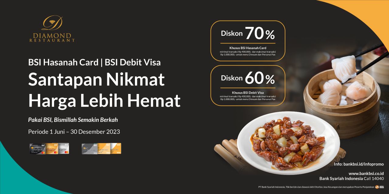 • BSI Hasanah Card : Diskon 70% minimal transaksi Rp 400.000,- dan maksimal transaksi Rp 1.000.000,- untuk menu Dimsum dan Personal Pax. • BSI Debit Card : Diskon 60% minimal transaksi Rp 400.000,- dan maksimal transaksi Rp 1.000.000,- untuk menu Dimsum dan Personal Pax |