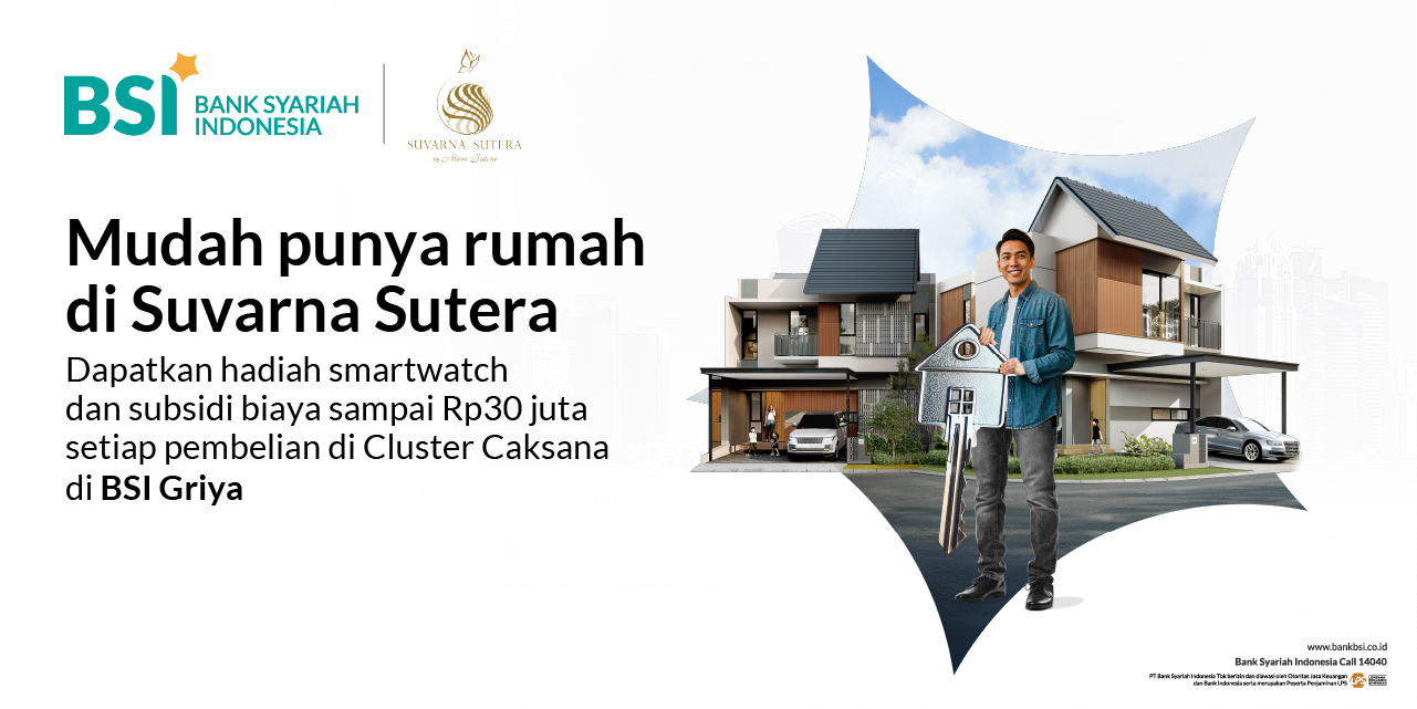 Q: Apa itu program BSI Griya x Suvarna Sutera? A: Sebuah kemitraan antara Bank BSI (Bank Syariah Indonesia) dan Suvarna Sutera. Melalui program ini, Anda bisa memiliki hunian impian dengan sistem pembiayaan yang mudah dan sesuai prinsip syariah di Cluster Caksana Suvarna Sutera, dengan hadiah menarik berupa Smartwatch serta subsidi biaya sampai dengan Rp30Juta untuk pembelian unit khusus di bulan Februari 2025. Melalui Program ini juga, dapatkan Special Price Ultimate BSI Griya khusus untuk Nasabah BSI. Q: Apa keunggulan program BSI Griya x Suvarna Sutera dibandingkan pembiayaan KPR lainnya? A: Program BSI Griya x Suvarna Sutera menawarkan pembiayaan KPR dengan prinsip syariah yang memberikan berbagai keunggulan, di antaranya: - Angsuran pasti hingga lunas dengan Margin special setara 3,79% fix 1 tahun - Tenor panjang - Biaya di awal dapat diangsur selama pembiayaan - Free Smartwatch (Untuk pembelian unit di bulan Februari 2025) - Subsidi biaya KPR maksimal Rp 30 Juta khusus pembelian Cluster Caksana (Untuk pembelian unit di bulan Februari 2025) Dengan berbagai keuntungan ini, Anda bisa memiliki rumah impian di kawasan Suvarna Sutera dengan cara yang lebih mudah dan sesuai prinsip syariah Q: Bagaimana ketentuan hadiah dan subsidi biaya? A: Hadiah dan subsidi biaya dapat diperoleh oleh Nasabah BSI yang melakukan pembelian unit di Cluster Caksana Suvarna Sutera pada bulan Februari 2025, selama kuota masih tersedia. Pastikan untuk segera melakukan pembelian agar tidak ketinggalan kesempatan mendapatkan Smartwatch gratis dan subsidi biaya KPR hingga Rp30 Juta. Q: Apakah ada promo khusus dari BSI selama periode program? A: Khusus untuk Anda yang telah menjadi nasabah BSI minimal 6 (enam) bulan, dapatkan promo spesial "Special Price Ultimate BSI" dengan margin setara 3,79% fix untuk 1 tahun. Segera kunjungi kami dan nikmati keuntungan spesial dari BSI dan Suvarna Sutera. Q: Berapa lama periode program BSI Griya x Suvarna Sutera? A: Periode program ini akan berlangsung hingga akhir bulan Februari 2025. Q: Apa saja dokumen yang dibutuhkan untuk mengajukan pembiayaan BSI Griya? '