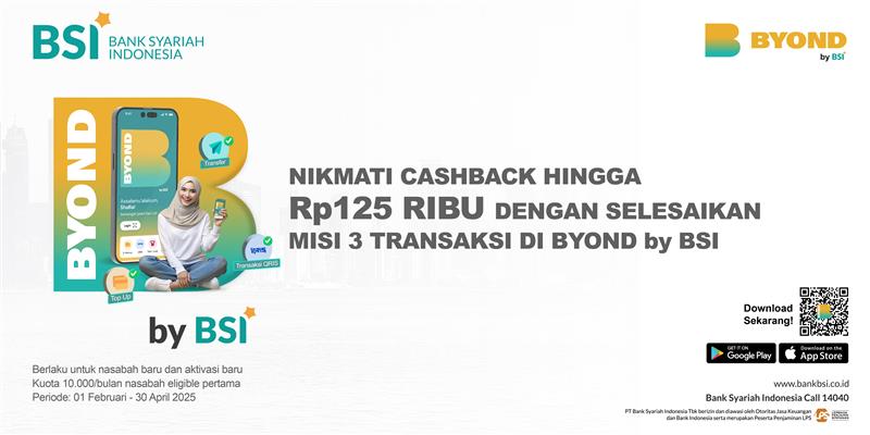 | Deskripsi | Program pemberian cashback bagi nasabah yang melakukan aktivasi dan transaksi min. 3x transaksi sesuai ketentuan melalui BYOND by BSI |