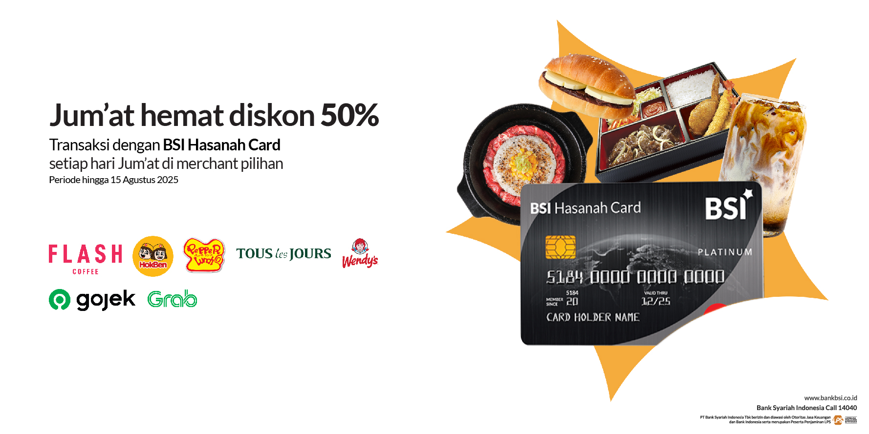 | Hokben | Diskon 50% hingga Rp 25 ribu minimal transaksi Rp 50 ribu | - Min. transaksi Rp 50.000,- (sebelum pajak) - Berlaku setiap hari Jum’at - Berlaku untuk pembelian langsung ke outlet Hokben - Berlaku untuk seluruh jenis BSI Hasanah Card (Platinum, Gold, Classic) - Berlaku untuk 1 kartu / transaksi / hari/ outlet - Tidak berlaku untuk BSI Debit |