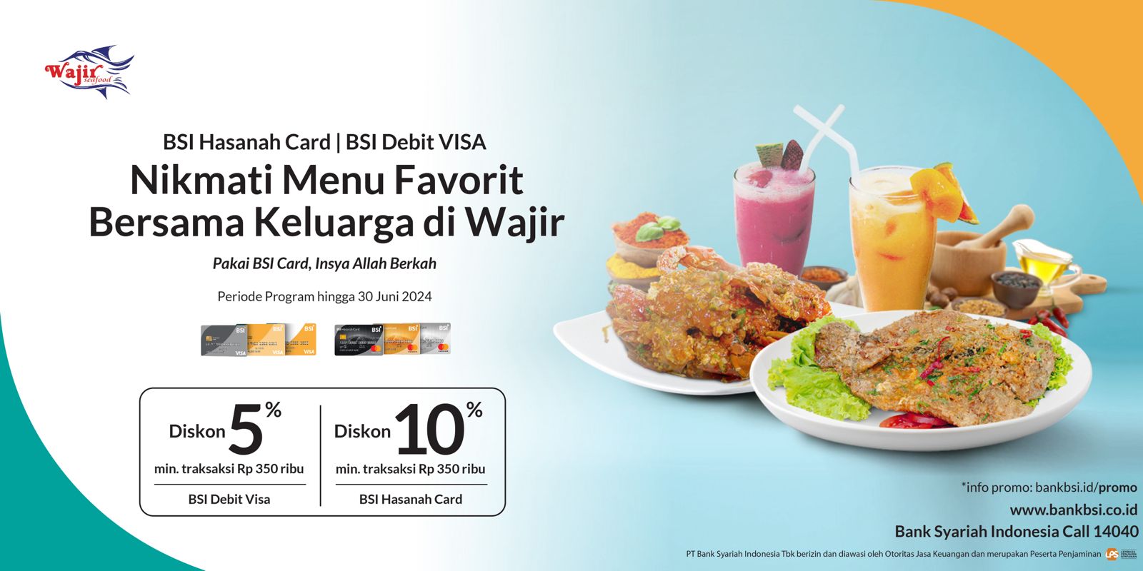 A : Jika pengguna BSI Hasanah Card atau BSI Debit Visa melakukan transaksi di Wajir Seafood Medan minimal Rp 350.000,- menggunakan BSI Hasanah Card atau BSI Debit Visa akan mendapatkan cashback hingga Rp 500.000,- yang akan mengurangi jumlah transaksi.