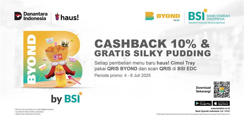 1. Setiap pembelian menu baru Haus Cimol Tray, akan mendapatkan Gratis Silky Pudding dan cashback 10% dengan pembayaran menggunakan QRIS BYOND dan scan QRIS di BSI EDC.