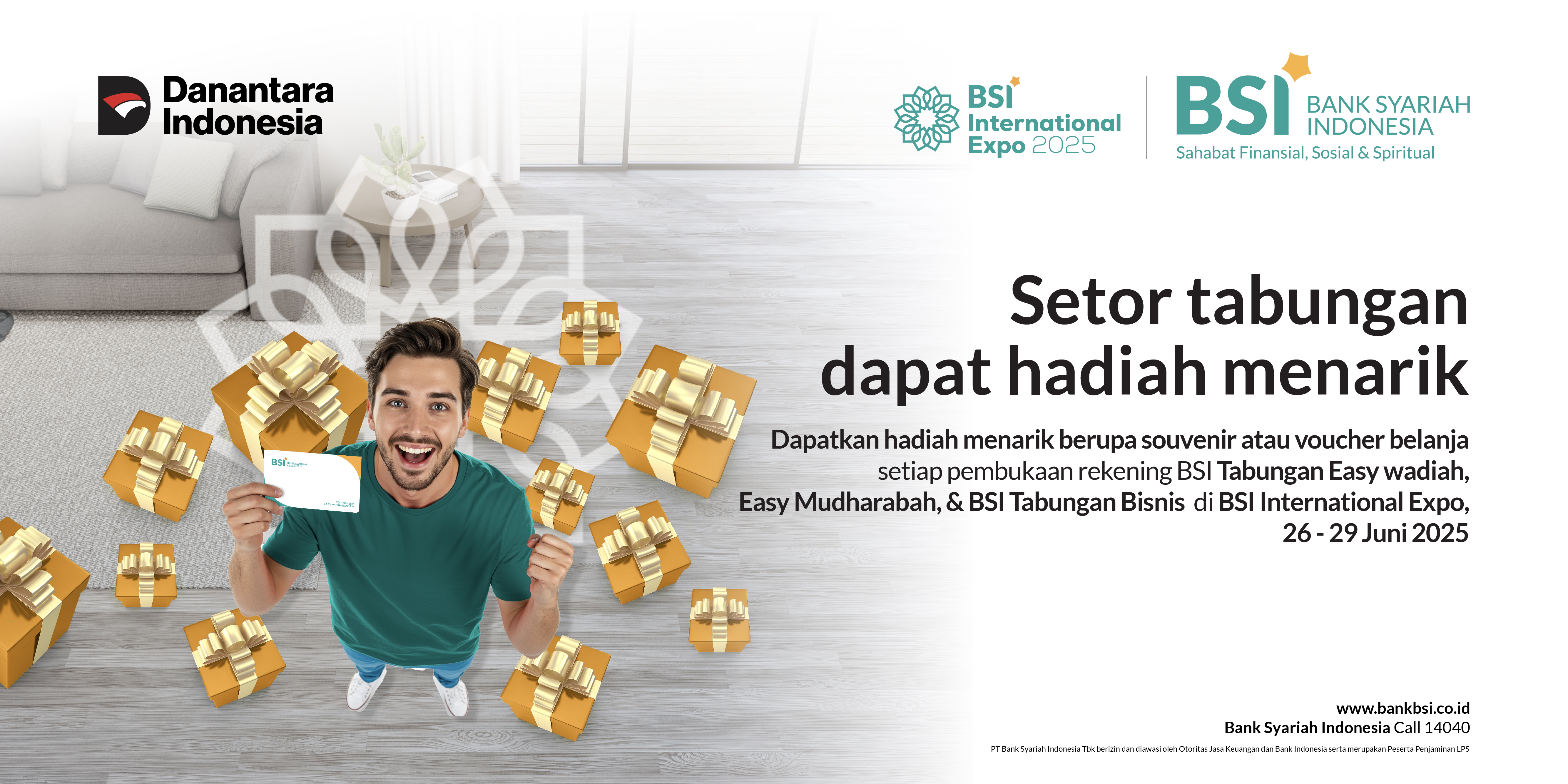 Setiap buka rekening BSI Tabungan Easy Wadiah/BSI Tabungan Mudharabah/BSI Tabungan Bisnis di Booth BSI, BSI International Expo 2025 akan mendapatkan hadiah langsung: