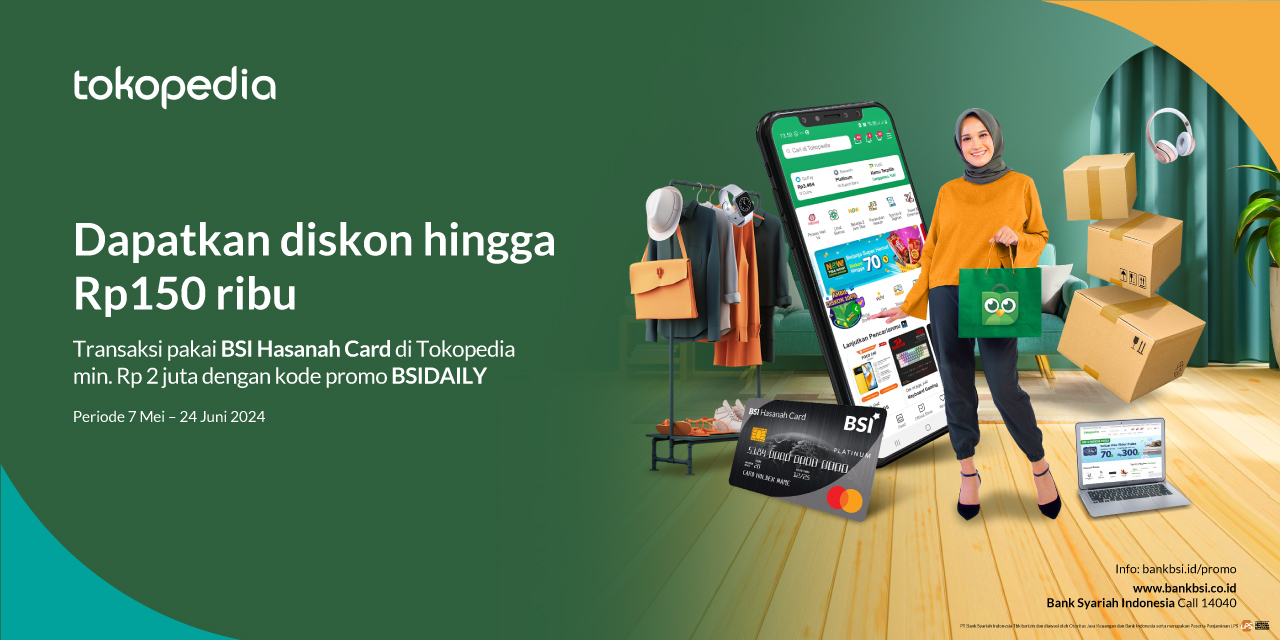 A : Pemberian diskon Rp150 ribu, dengan min. transaksi Rp2 juta menggunakan BSI Hasanah Card di aplikasi Tokopedia