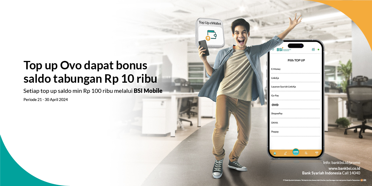 | 1 | Deskripsi Program | Pemberian saldo tabungan sebesar Rp.10.000,- (Sepuluh Ribu Rupiah) diperuntukkan bagi nasabah yang berhasil melakukan transaksi top up OVO melalui BSI Mobile minimal Rp. 100.000 (seratus ribu rupiah). |