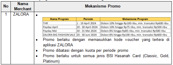 1. Q : Promo BSI apa saja yang sedang berlaku pada merchant Zalora?